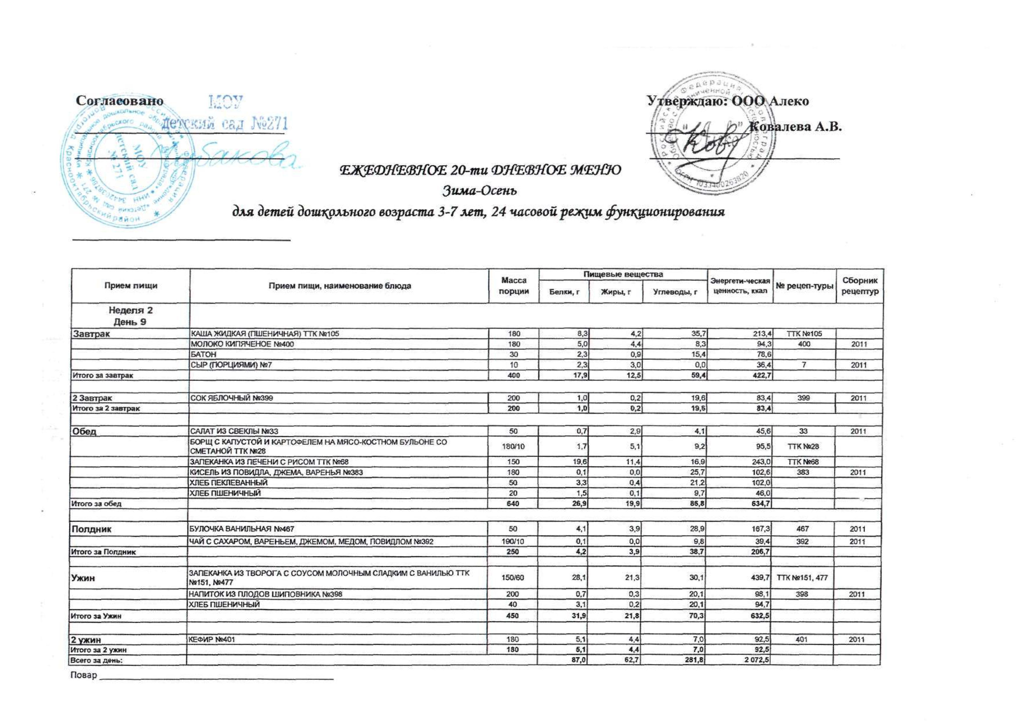 Меню на 15.12.2025 года в МОУ детский сад № 271 для детей 3-7 лет (24 часа)